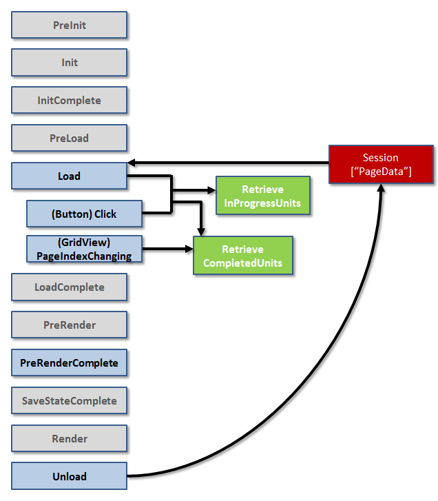 - INITCOMPLETE: This is used to process all those tasks that require initialization to be completed. Basically it checks whether the pre-plans are executed or not. In other words whether the list of all the controls collections that were added to the page object have had memory and have been instantiated. Also we can"t use this event to make changes to the view state since the control values have not yet been loaded.