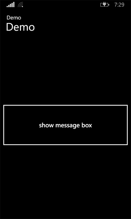 Custom Message Box is a control provided in the WP8 toolkit for customizing the interface and content of a message box. It enables you to add various UI elements to the message box that is not possible in the default message box. In this demo, we will create all our UI elements from code only.