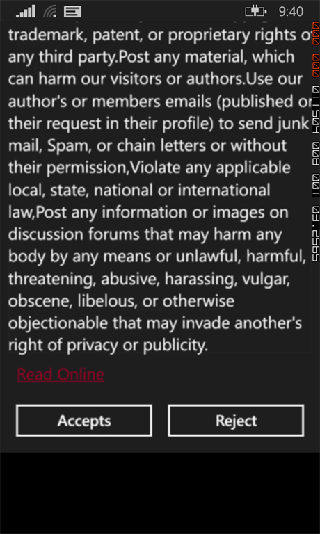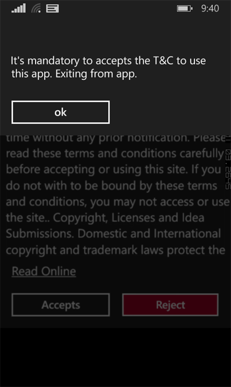 The following code creates a T&C dialog for your app. Here in this demo, I'm placing a text file inside the scroll viewer that will be shown on the message box. This text file contains my T&C's. To do this I have created one text block that will contain all the text of the file, one scroll viewer for enabling the scroll on text block, one hyperlink button to allow the user to read the policy online and finally all these controls are grouped into one stack panel. The message box content property is set to that stack panel. If the user accepts our T&C then the app will continue and if the user rejects the T&C's then the app will terminate itself. So let's see how to code it.
