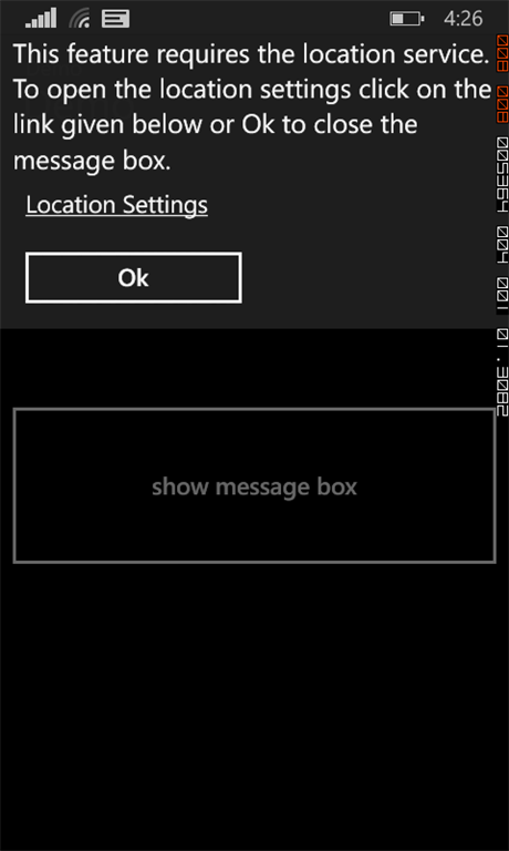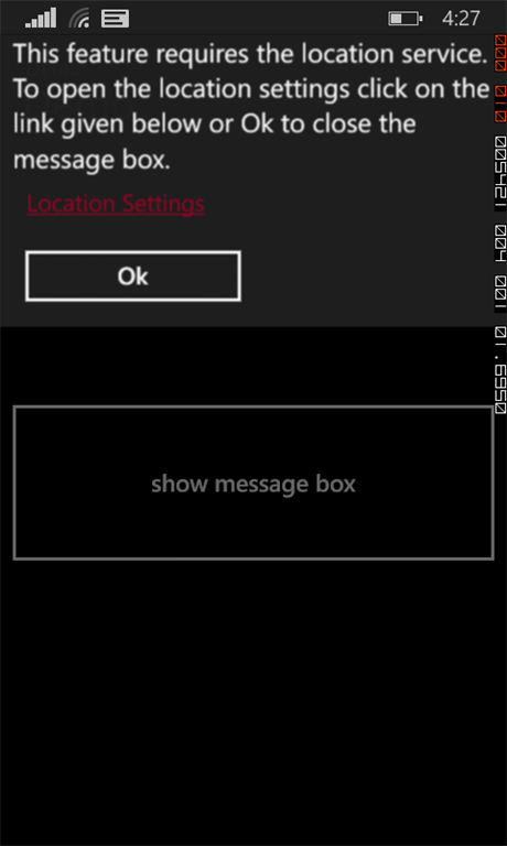 Text="This feature requires the location service. To open the location settings click on the link given below or Ok to close the message box.",