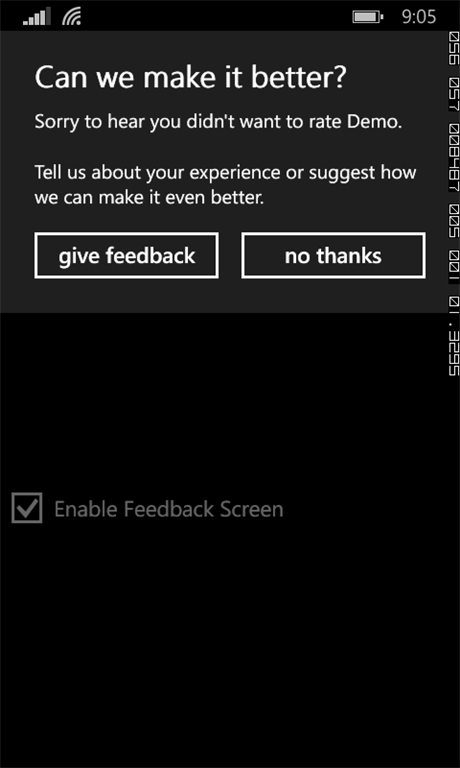 This article explains how to control the message box screens of the Rate My App Component. Both screens, namely the review and feedback screens, are very useful and generally used in the same combo. But in some situations we may want to split these two screens. This article explains this.