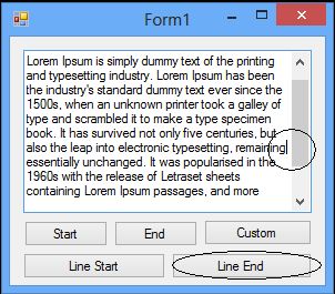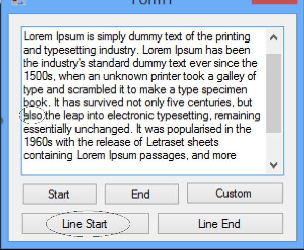 In this function we are extracting the index of the first character from the given line using the GetFirstCharIndexFromLine method. Next we are using the select to move the caret to that char.