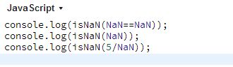 And the last one that is superior or a VVIN number in JavaScript is the number that is Not a Number! Yes! it's none other then NaN. This Mr. is not equal to any one, not even to his duplicate (Other NaN). Any comparison made with NaN will lead the result to false and the entire script is ruined.
