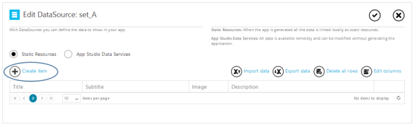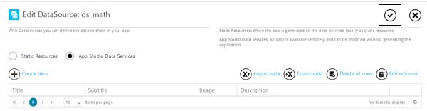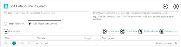 So far it has been the same as we have done in a static Data Source but now we want to store our data in the cloud. To store our data in the cloud we need to use a cloud storage service provided by App Studio. This service is named "App Studio Data Service". To use this service: