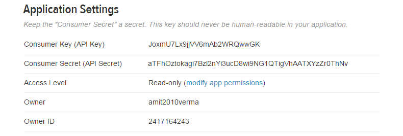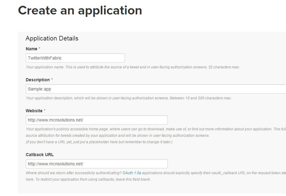 - Please go to https://dev.twitter.com/apps/new and create a new application.