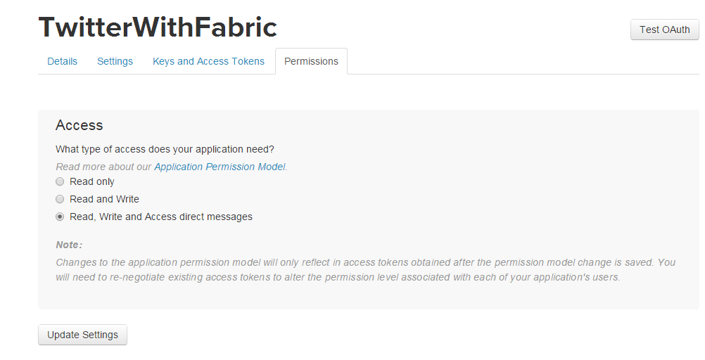 - Go to the permission tab and update the setting for Read, Write and Access of direct messages.