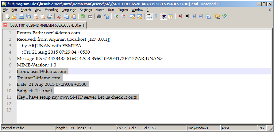 - string mailstatus = SendEmail("[email protected]", "Testmail", "Hey i have setup my own SMTP server.Let us check it out!!!");
