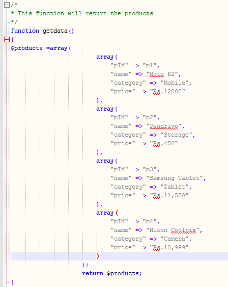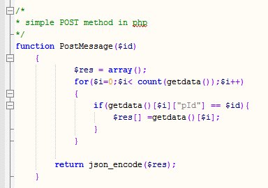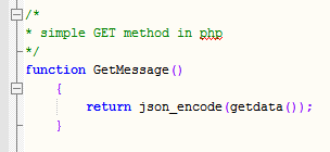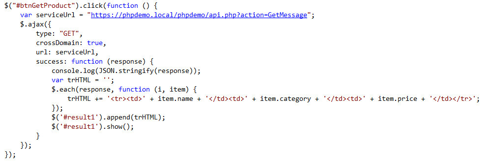 GetDataThis function will hold all the products in the array. We are going to use this function across various functions.GetMessageThis function will return all the products in the JSON format that we can later bind it in the HTML using jQuery.The above method will call our getdata function and convert it to JSON format and return it. To test the API, just call them via a browser.I have deployed the above file in IIS and created a folder in the “C:\inetpub\wwwroot\phpdemo” and copied the API file.Call the API service in the browser and check whether you are getting the response as in the following:PostMessageThis function will return the product based on the product Id. Since it is a POST service, we cannot make an API call directly from the browser. You require some plugins in order to test the POST API services.Let me show you how to call the PHP API services using jQuery. As I said earlier, the GetMessage function will return all the products.To show a demo, I have created a button in HTML. Whenever you click on the button, it will call the GetMessage API service using jQuery. Here is the code snippet.