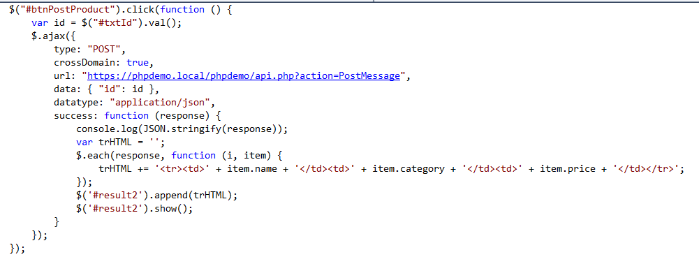 In a similar way I have created another Ajax call to make a POST API request. We need to send the data to the PHP service to get the respective data. I’m passing the data in JSON format to the API service.To show a demo I have created a TextBox with a button. You need to provide the product id on the TextBox and click on the button. Using jQuery I’m retrieving the value from the TextBox and converting it into the JSON and passing the value to the service using Ajax.Again I’m binding the response data in the table.I have added the source code with this article. I’m a .Net developer. One of my projects required making PHP API calls. I was looking for some resources on the internet. Based on my learning I have created this. I hope it will help beginners.