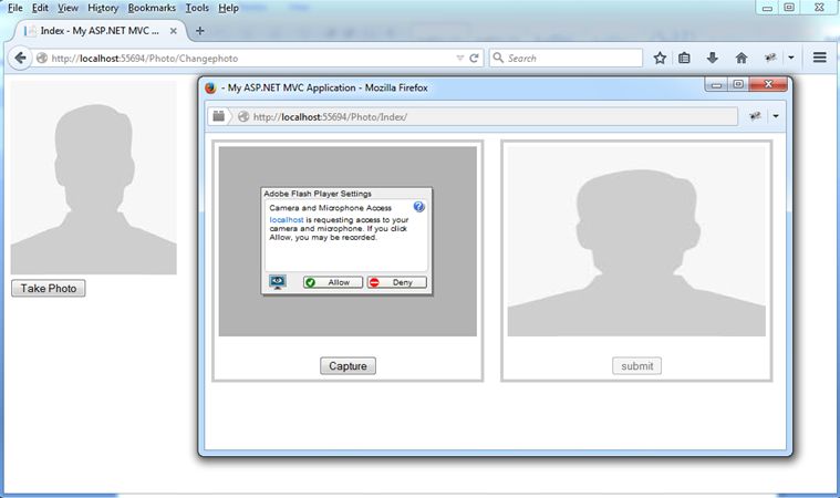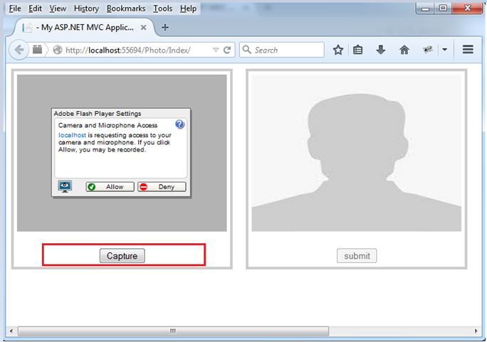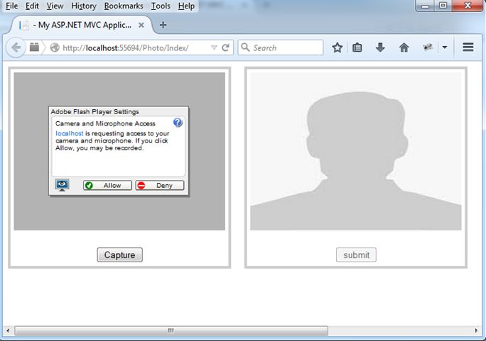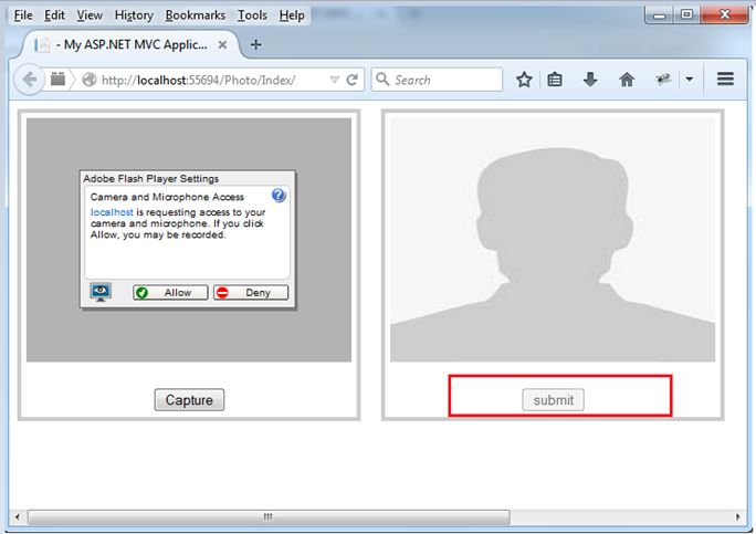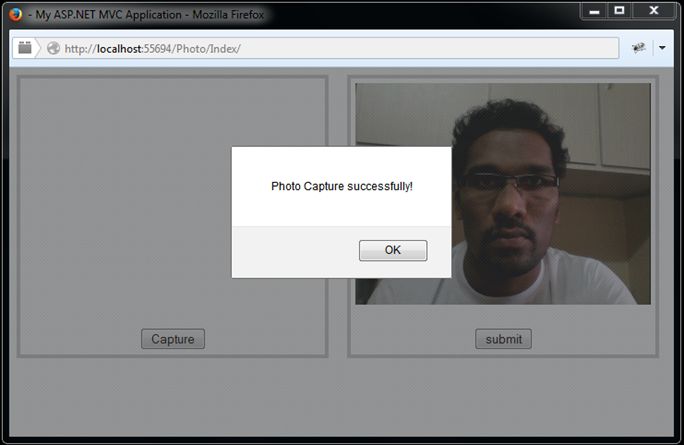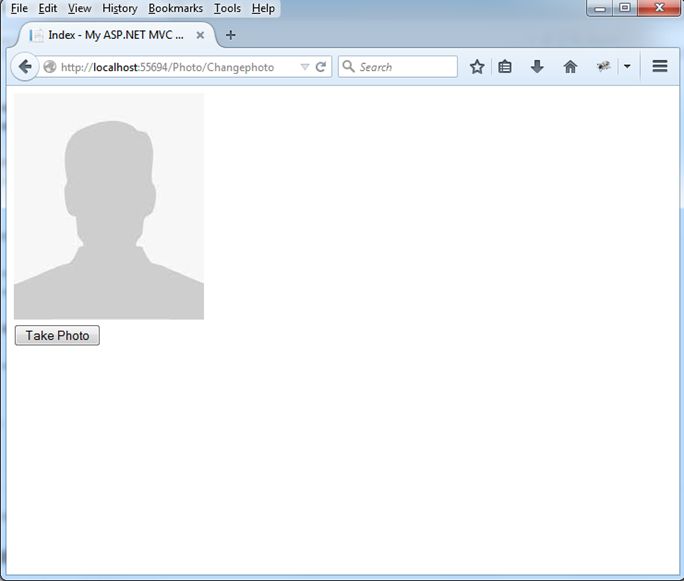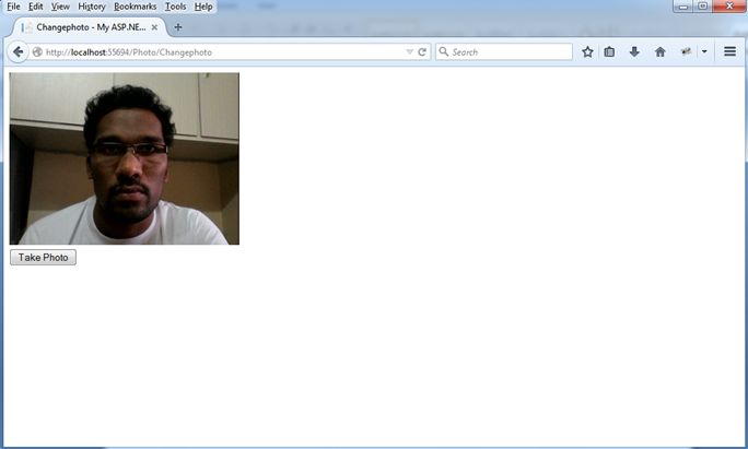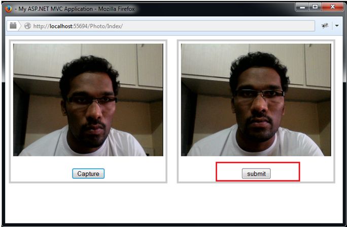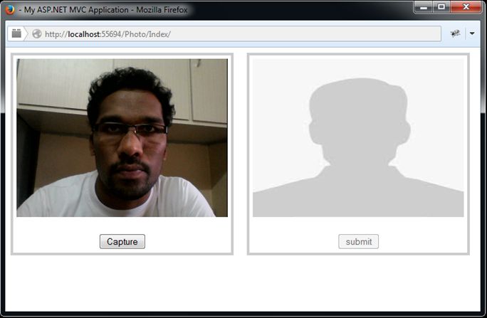 Inside this Action method I will check whether or not Session[“val”] has a captured Imagename and if not then I display a default image (ViewBag.pic = "../../WebImages/person.jpg"; ) else I will display the captured image ( ViewBag.pic = "http://localhost:55694/WebImages/" + Session["val"].ToString(); ).