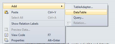 Now double-click on Dataset, it will open inside that right-click and select Add inside that select DataTable.
