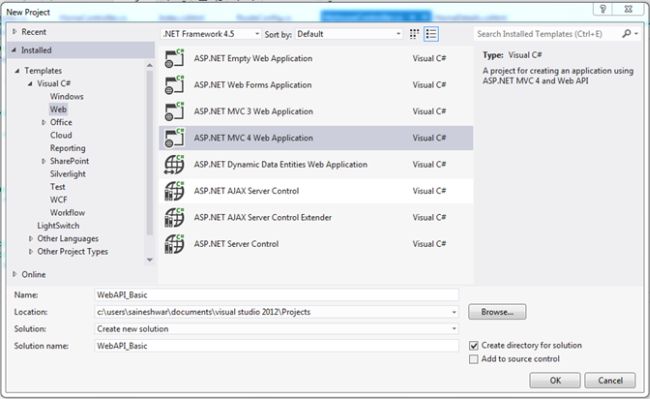In the template pane select Installed Templates and expand the Visual C# menu. Inside that Visual C# select Web. In the list of projects select ASP.Net MVC 4 Web Application.