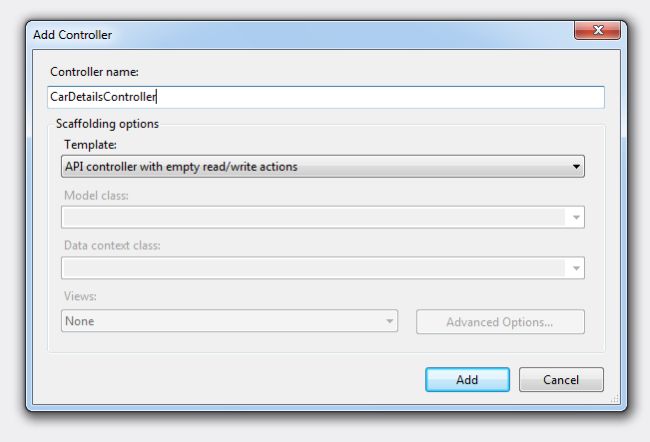 Right-click on the Controller folder and add a new Web API Controller with the name CarDetailsController and in the template select API Controller with an empty read / write action.