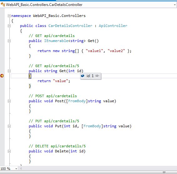 For testing I am passing http://localhost:32359/api/cardetails/1 for calling the method get.