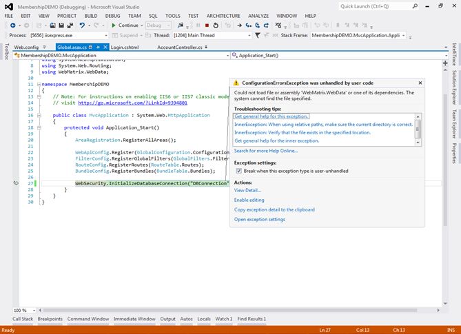 - WebSecurity.InitializeDatabaseConnection("DBConnection", "Users", "Id", "UserName", autoCreateTables:true);