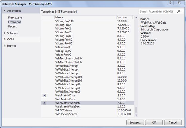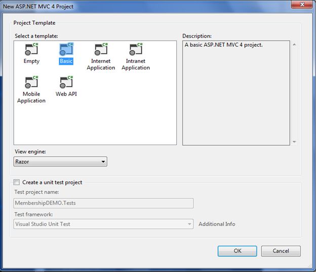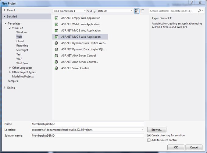 In Visual Studio select "File" -> "New" -> "Project...". A new wizard will be shown. Inside that select Visual C# Template and inside that Web and from the list of templates select ASP.NET MVC 4 Web Application then provide name for the project “MembershipDEMO”.