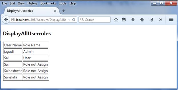 Inside this action Method we will display all the Roles assigned to the user with their Username.