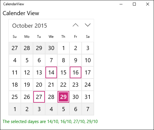 - <CalendarView Name="myCalender" Margin="20,20,0,0" SelectedDatesChanged="myCalender_SelectedDatesChanged" SelectionMode="Multiple" />