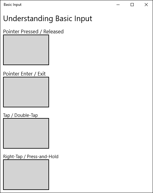 Step 1: Open a blank app with four borders with a text block child to it by copying the following XAML code in to your page. Please have a look at the different events assigned for each.