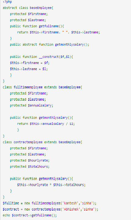 getmonthlysalary(). Abstract class can only be declared, it is not implemented. You can implement it anywhere in the new class created. An abstract class declared should be included at least once in every class. Later on you can include another function and its behavior also.
