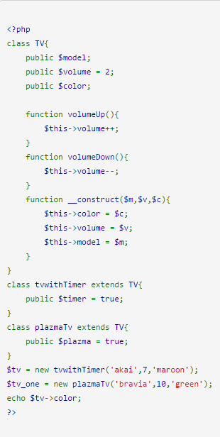 In the above code we have used a child class. In defining a child class we use a keyword extends before the parent class whose child class is to be made. You can then add variables which you have to include. In the case of the above example I have used two child classes ‘tvwithTimer’ & ‘plazmaTv’. Inside that I have created two public variables ‘timer’ &’plazma’ respectively. This is basically done to add extra features to the main class. This helps in code re-usability.Thus, Inheritence is an important concept of OOPS.