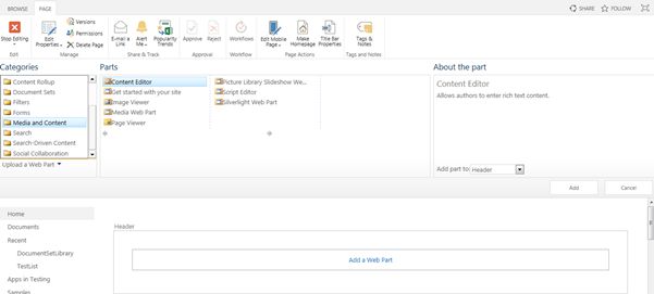 - Edit the created page and add the Content Editor Web Part. This web part is available under the Media and Content category.