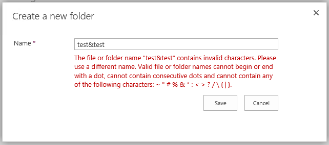 Server error: The file or folder name “<folder name>” contains invalid characters. Please use a different name.