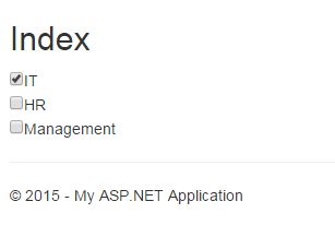 - @Html.CheckBoxFor(model => item.IsSelected)@item.DepartmentName