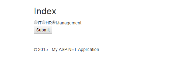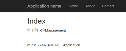 13.         @Html.RadioButtonFor(p => p.SelectedDepartments, department.DepartmentName, department.IsSelected == true ? new { Checked = "checked" } : null)@department.DepartmentName