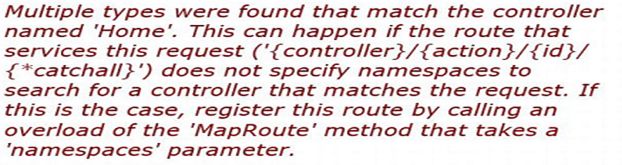 When we request a URL and the routing engine recognizes it then the framework extracts the value of the controller from the segment and searches for the specific class, for example if I request URL http://localhost/ Home then it will search the HomeController class and it is not a fully qualified name, in other words if we have 2 HomeController classes in different assemblies then it will throw an exception as in the following: