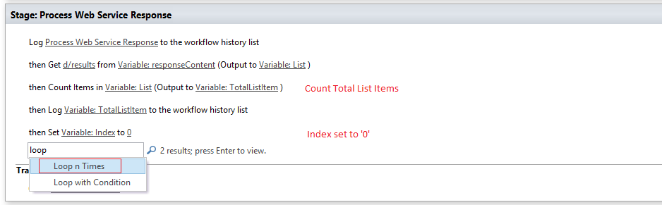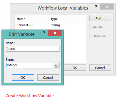 - Finally, create a new Integer variable called index and set it to 0 (Set Workflow Variable), this will be the loop index.