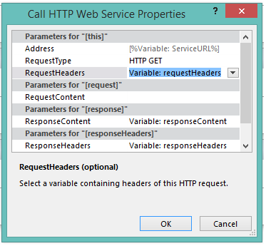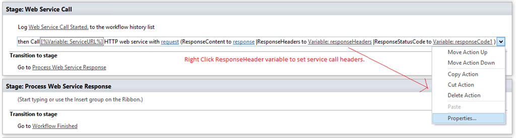 Then we set the request headers to be the requestHeaders variable we created just now, by clicking on the properties for the Call on HTTP Web Service action: