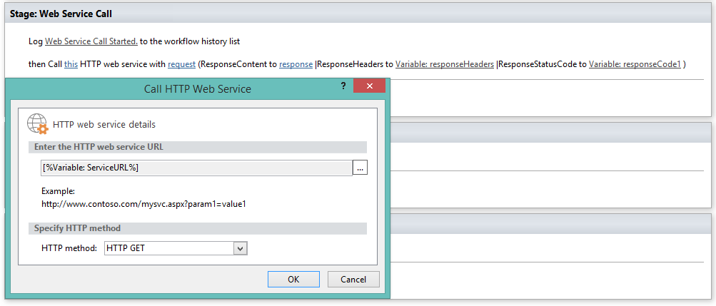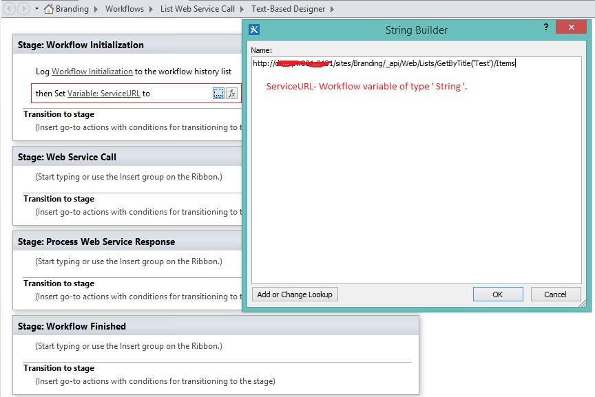 Set workflow variable "ServiceURL" as Web Service URL.