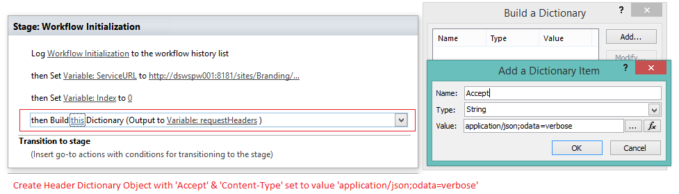 Service Call Header: Next, we add a Dictionary variable (Build a Dictionary action), call it requestHeaders and initialize it as this: