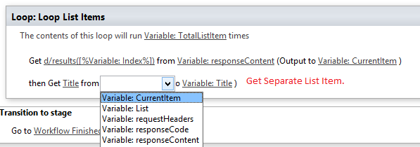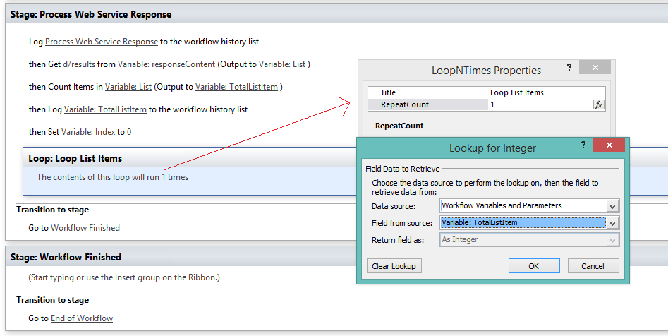 - Add a loop (Loop n Times), call it Loop Task Items, and set the loop variable to TotalListItem variable.
