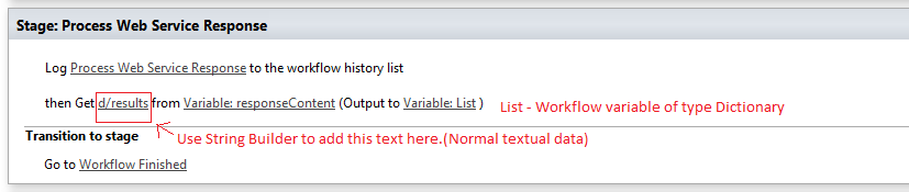 - Add a Get an Item from a Dictionary action, set the item as d/results, the source variable reponseContentand the output to a new variable of type Dictionary called List.