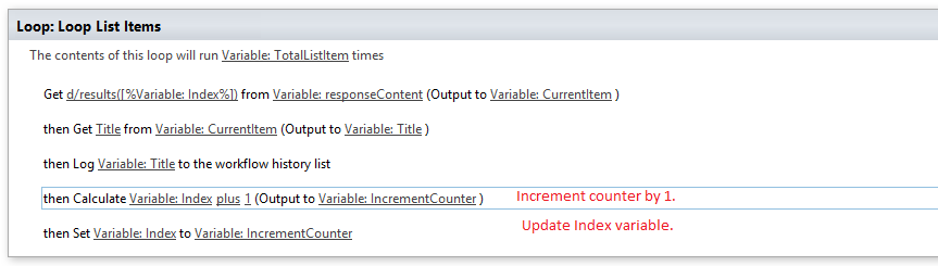 - Then set the index variable to be the IncrementCounter(Set Workflow Variable).