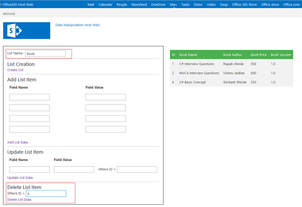 - <a href="#" onclick="Wingtip.JSOMHostWebCollections.HWDeleteListItem()">Delete List Data</a>