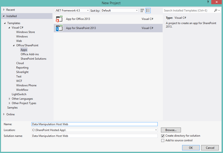 Step 1: Create SharePoint Hosted App with Office 365 account credentials. Open Visual Studio and select New Project as in the following,