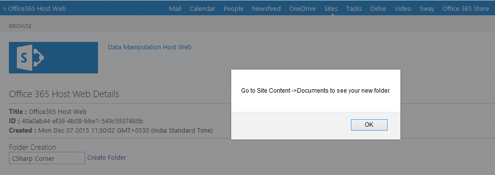 - alert("Go to Site Content ->Documents to see your new folder.");