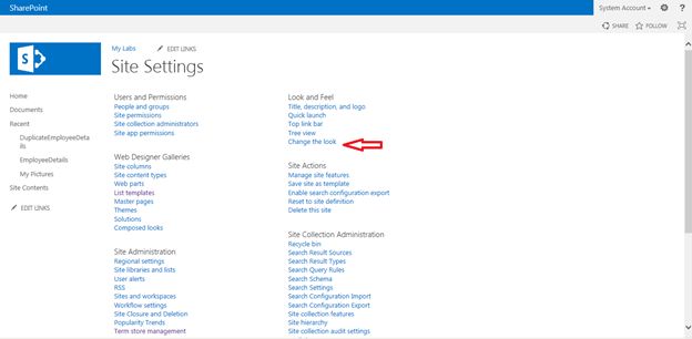 Once clicking the Site Settings, the screen shown in Figure 2 will open. In Site Settings, click Change the look.