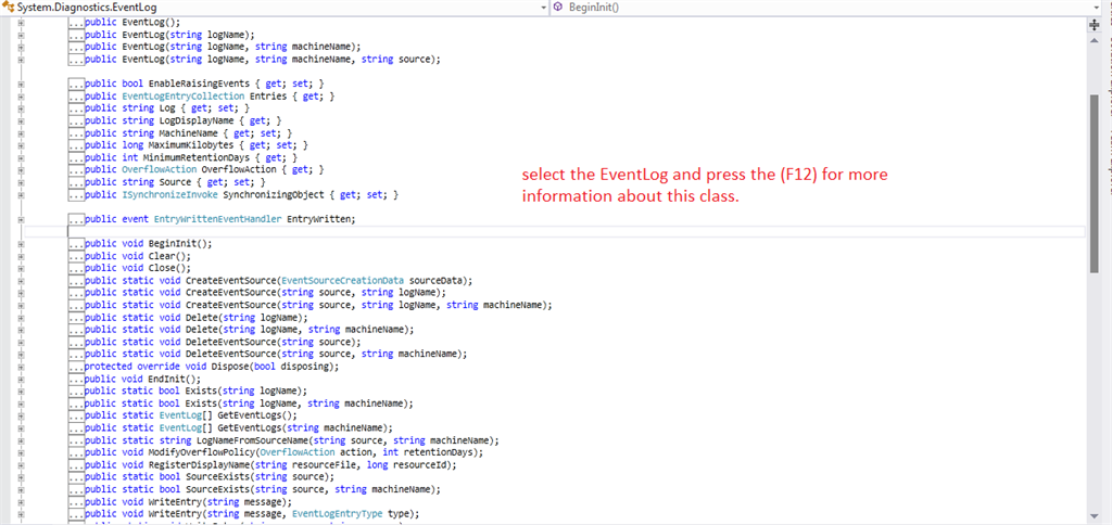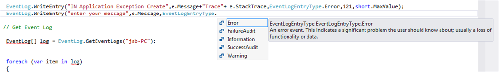 Event Log in C#First of all we need the reference the Event log class or namespace. The namespace is System.Diagnostics.