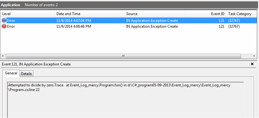 Eventlog.WriteEntery(“your source message”, “your exception message”,EventLogEntry.Type.(have five type of Entry type), specified EventID, Short category);