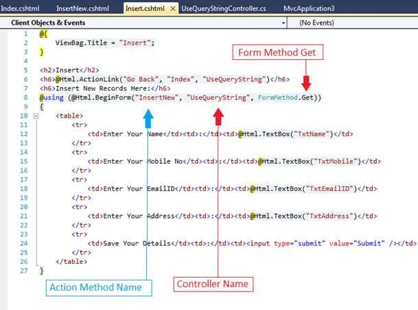 - @using (@Html.BeginForm("InsertNew", "UseQueryString", FormMethod.Get))
