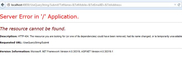 Note: To get a value with a Query String, we need to declare the form method as Get only.