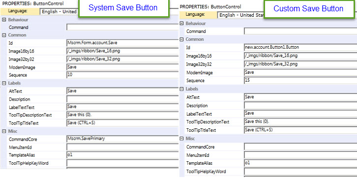 - Copy all properties system Save button to our custom button except the Sequence and CommandCore properties (we need to copy and paste these properties one by one)