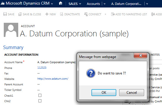 Publish web resource and open any account record. Change some field value and click on the Save button, you should get a prompt as in the following: