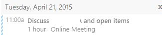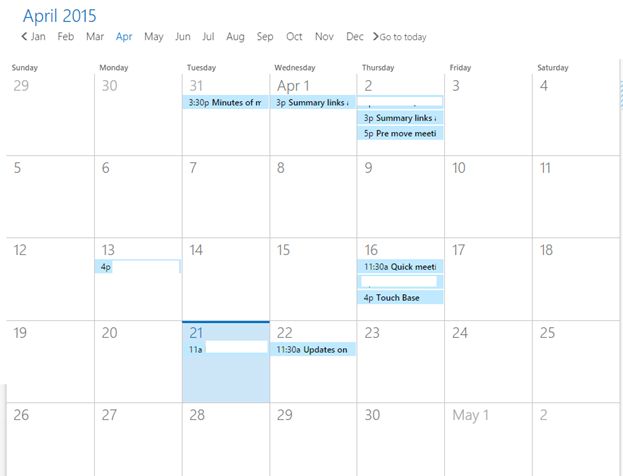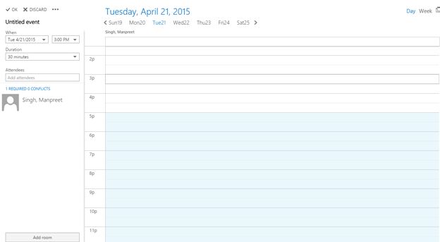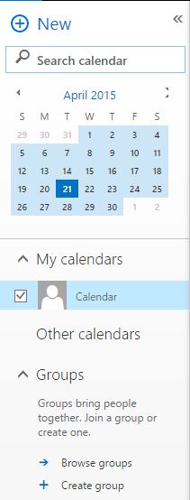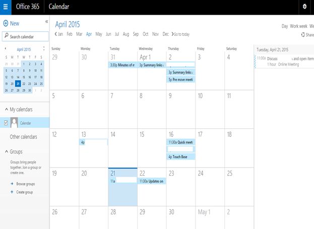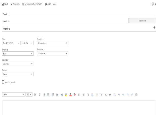 Outlook User's groups.CenterOn the center we have the calendar that can be configured to set up a meeting with a monthly view.RightHere it will list all the current calendar items related to “Today”.New Event/AppointmentAs in the screen below, you can create a new event or appointment by filling in the Event, Location, Attendees, Time and Body Details.AssistanceHere you can also use the assistance as in.
