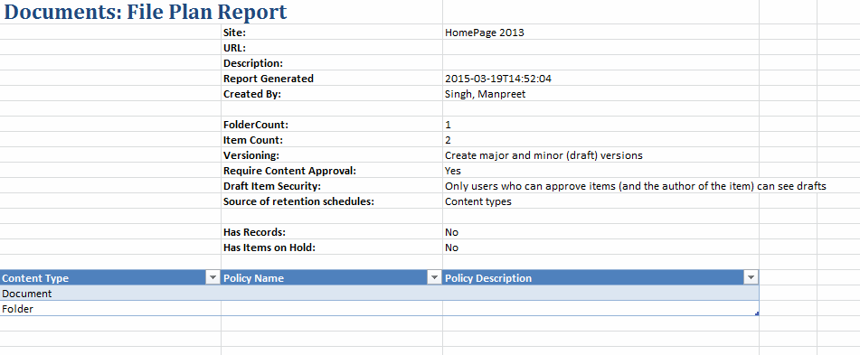 - The generated report will be divided into Summary, Retention Details and Folder Details.