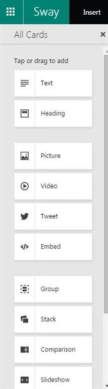 You need not worry about uploading stuff or making a separate database for it. Sway is seamlessly integrated with OneDrive, your devices, social networks and the web so you can drag and drop your content right onto your canvas.